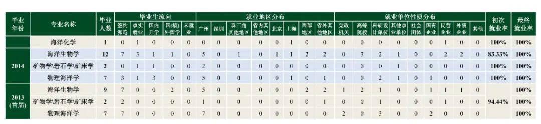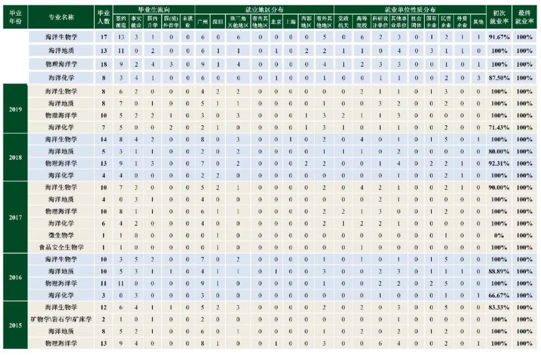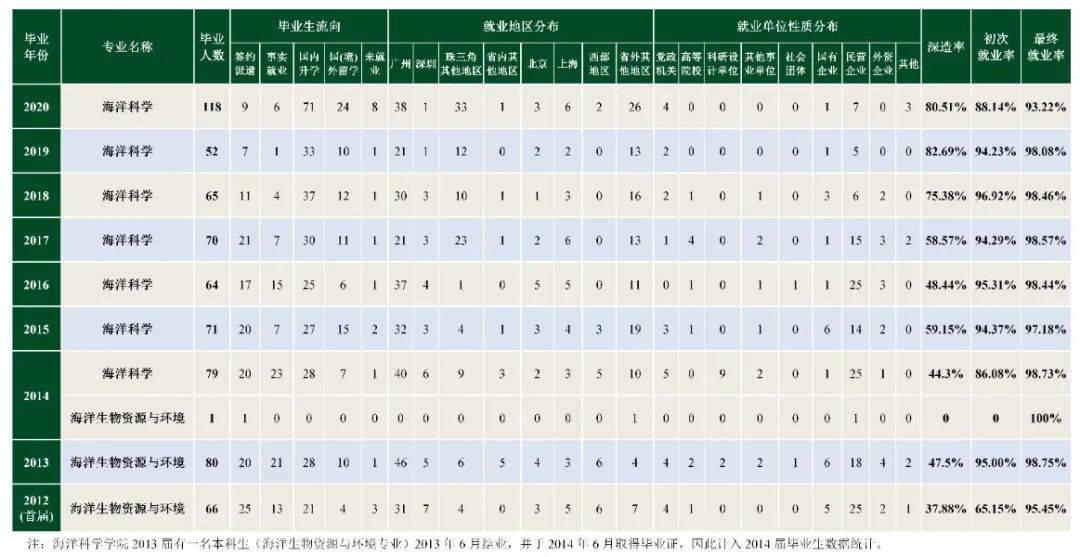 中山大学海洋科学学院成立于2008年6月,同年9月招收首届全日制本科生,2010年开始招收首届研究生。海洋科学专业下设海洋生物、海洋地质、物理海洋和海洋化学4个方向。海洋科学本科专业被列入为广东省战略性新兴产业特色专业点、广东省重点专业、广东省特色专业和国家级专业综合改革试点,被批准为教育部“三全育人”综合改革试点院(系),入选国家级一流本科专业建设点,获得广东省教学成果奖一等奖、二等奖各1项。海洋科学专业为广东省重点一级学科,在教育部第四轮学科评估中名列全国第三(2017)。 根据中山大学公布的历届毕业生就业数据统计,海洋科学学院毕业生升学、就业情况良好。近年来,毕业生最终就业率达98%。2020届本科毕业生最终就业率93.22%,研究生最终就业率100%;2020届本科毕业生深造率达80.51%。 本科毕业生主要深造院校有:中山大学、斯坦福大学、伦敦大学学院、帝国理工学院、新加坡国立大学、爱丁堡大学、清华大学、香港大学、香港科技大学、多伦多大学、麦吉尔大学、京都大学、北京大学、复旦大学、墨尔本大学、布里斯托大学、香港中文大学、昆士兰大学、悉尼大学、英属哥伦比亚大学、代尔夫特理工大学、莫纳什大学、上海交通大学、格拉斯哥大学、隆德大学、波士顿大学、浙江大学、华威大学、香港理工大学、伯明翰大学、中国科学院等。 毕业生主要就业单位有:国家外交部、自然资源部(各下属机构)、各省市相关政府部门(含选调生)、中国科学院(各研究所)、高等学校(中山大学等)、人民日报、南方海洋科学与工程广东省实验室、广东省气候中心、广州海洋地质调查局、中国海洋石油总公司(各分公司)、中国石油化工集团公司(各分公司)、中交广州航道局有限公司、深圳华大基因研究院、美国哈佛大学医学院、埃克森美孚(中国)投资有限公司、宝洁公司、强生公司、佳能(中国)有限公司、花旗银行、招商银行、中国建设银行、广州证券、华为等。 学院历届毕业生所属专业、人数、流向、就业地区分布、就业单位性质分布、深造率、初次就业率(截止至毕业当年8月)、最终就业率(截止至毕业当年12月)情况见下表。 联系/咨询:李颖,0756-3668257,liying95@mail.sysu.edu.cn 中山大学海洋科学学院 海洋科学学院历届本科毕业生就业情况表 海洋科学学院历届毕业研究生就业情况表 |