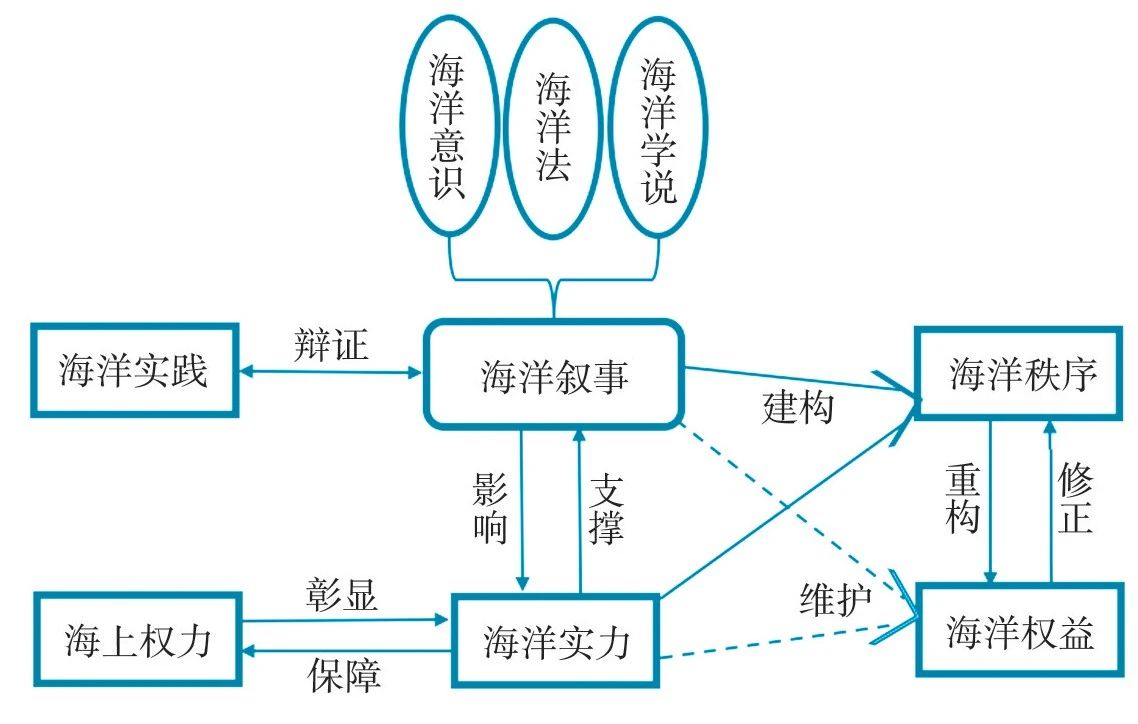海洋叙事是海洋国家为了获得更为丰厚的收益而构建的一套塑造海洋秩序、捍卫海洋利益与权力的话语体系,是对海洋实践、海洋实力、海洋权力与海洋秩序的记载、建构与体现。简单地说包括海洋意识、海洋法与海洋学说。海洋叙事作为概念化工具,存在夸大、缩小与还原等几种形态,既可起到前瞻性、创新性地引导与推动作用,也可起到滞后性、压制性地贬低和阻碍作用,内容随着人类认识、改造与利用自然的能力以及人类思维能力的变化而变迁。海洋叙事、海洋实践与海洋实力是国家维护海洋权利与权力的重要支撑与手段。海洋实践是利用、控制、占有、开发、研究、治理与发展海洋的综合性人类涉海活动。海洋实力是海洋实践的能力和状态,是海洋权力的来源与保障,一般通过海上力量与海洋叙事等介质展现出来(如图1所示)。