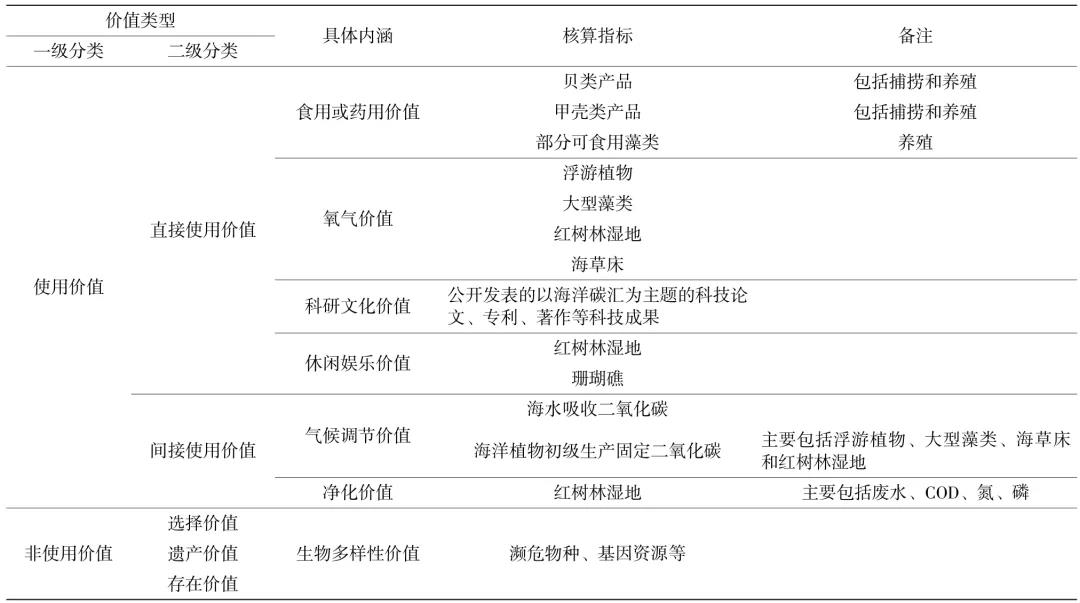 “五分类”模型较为全面地考虑到了海洋碳汇的价值构成,既包括有形的价值,又包括无形的价值,既有当代人消费的价值,又有后代人消费的价值。本文构建了海洋碳汇经济价值核算的指标体系,如表2所示。